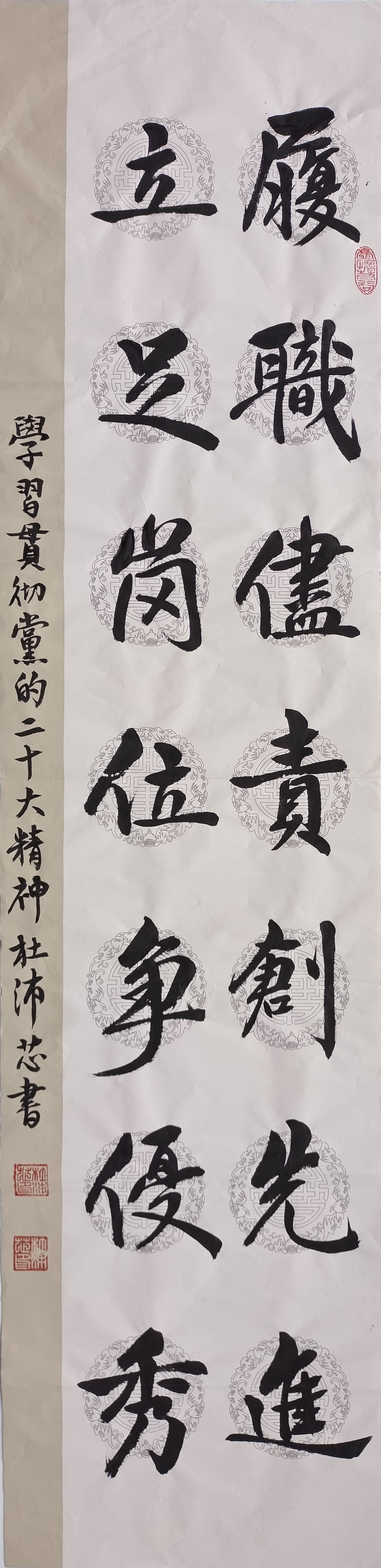 为深入学习宣传贯彻党的二十大精神,深刻领会习近平新时代中国特色社会主义思想,贯彻落实以伟大自我革命引领伟大社会革命的重要要求,本作品采用行书书体书写主题标语,意在鼓励自我提升,争创岗位优秀。